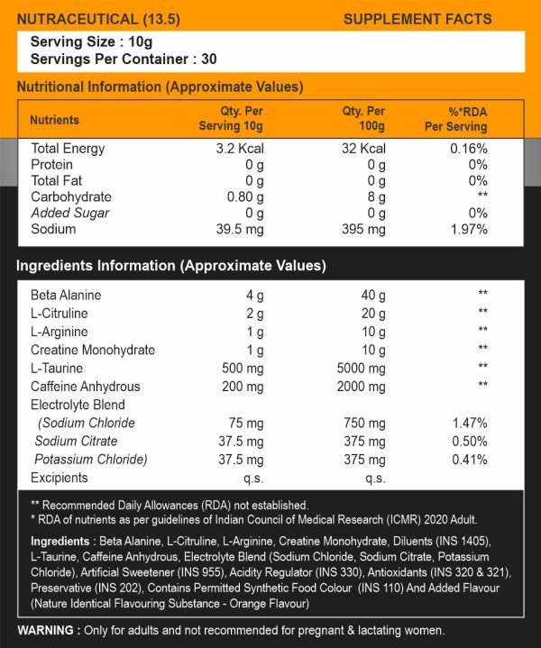 How to Use: Mix 1 scoop (10g) with 250-400ml of water. Consume 20-30 minutes before training. Avoid taking it near bedtime due to caffeine content.